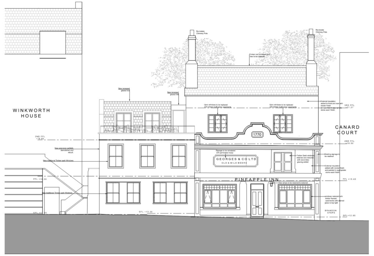 The project involved the extensive remodelling and refurbishment of the Grade II listed former Pineapple Pub. The proposed scheme for the site was to provide up to eight 1-2 bedroom apartments over 4 storeys. The plan form of the 17th – 19th century parts of the original pub was to be retained with adjustments to the roof to make the currently disused space functional. The project was to also include the excavation to the south of the west cellar to create a terrace, bringing natural light into the space, and create a stair to provide access from the 1st floor to gardens at the rear. Additionally, the existing floor level in the rear cellars would be lowered by up to 0.7m to increase headroom. The Project never reached site as the property was sold on and developed by others.